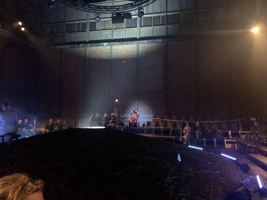 Viewers were invited to sit in a circle around a mound of earth sparsely covered with grain, which offered a unique and striking 360-degree perspective on the performance.